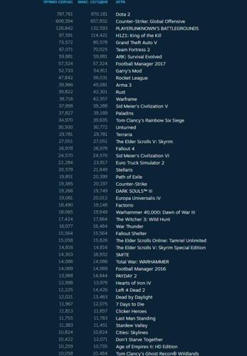 Стратегия Warhammer 40,000: Dawn of War III уверенно занимает третью и четвертую позиции, демонстрируя стабильный интерес аудитории. Тем временем тактический шутер Counter-Strike: Global Offensive опустился на пятое место, уступив свои позиции. Мультиплеерный проект H1Z1: King of the Kill переместился на шестую строчку, а на седьмой расположился шутер-скаут Sniper Ghost Warrior 3.