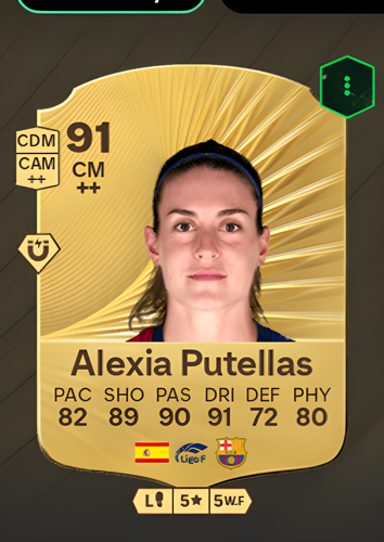 Alexia Putellas Segura's Gold Rare card stands out as an exceptional Center Midfielder, boasting an impressive overall rating of 91. With key attributes such as 82 pace, 89 shooting, 90 passing, and a remarkable 91 dribbling, Putellas is equipped to control the midfield and drive her team forward. Her solid 72 defense and 80 physicality further enhance her versatility, making her a well-rounded option in both attack and transition. As a central playmaker, this card offers a dynamic combination of technical skill and tactical intelligence, allowing you to orchestrate attacks, break down defenses, and seize scoring opportunities to dominate matches.