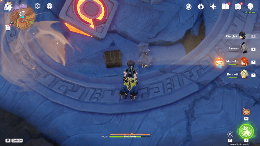 Après avoir engagé le dialogue avec le personnage, il est nécessaire d’utiliser les aptitudes d’un tatankasaure ou d’un membre du collectif de l’abondance pour détruire la pulvérite présente dans la zone. Cette étape vise à révéler trois glyphes d’or dissimulés dans le secteur. Une fois localisés, il faut les toucher pour qu’ils se regroupent près du premier glyphe situé à proximité de Mposo. Ces glyphes sont dissimulés à divers endroits : dans la roche en pente menant au phlogistique liquide, sous une arche de pierre voisine du même liquide — mais attention, activer ce glyphe peut déclencher un combat contre un avatar fluide de lave — et enfin, plus haut, dans une formation rocheuse contre une paroi escarpée. Lorsque vous rassemblez les quatre glyphes, un ancien mécanisme s’active, révélant un coffre précieux contenant probablement des trésors ou des objets rares.