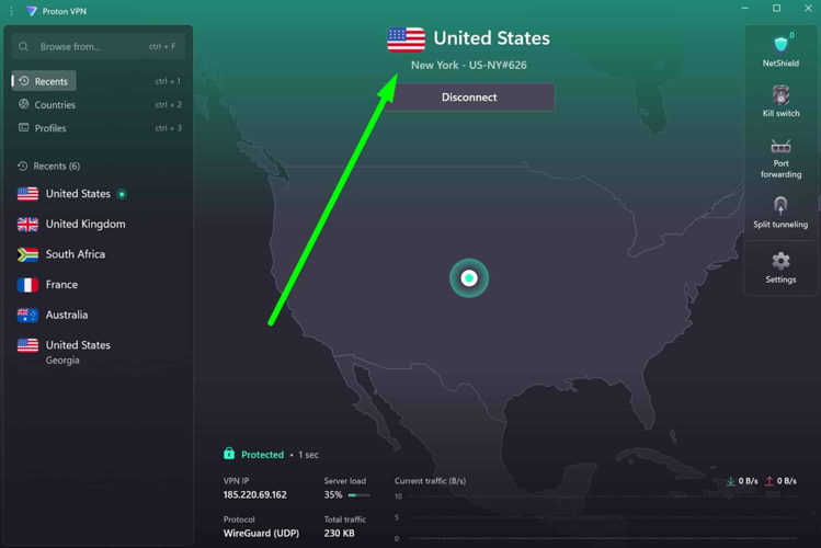 - Navigate to the server selection interface, choose a VPN server located in your desired country (e.g., United States or United Kingdom), and initiate the connection.