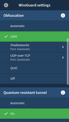 For users who prefer LWO to be enabled by default, it can be turned on manually within the app’s settings—navigate to VPN settings, then WireGuard settings, and select obfuscation to enable LWO.