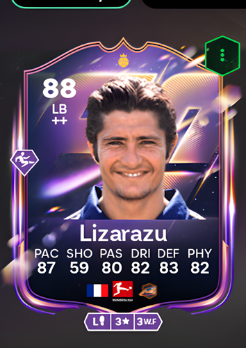 Bixente Lizarazu's Heroes card stands out as a top-tier Left Back with an impressive overall rating of 88, showcasing a well-rounded set of attributes that make him a valuable asset on the pitch. With a remarkable pace rating of 87, Lizarazu has the speed to keep up with even the quickest wingers, while his 83 defense and 82 physicality ratings ensure he is solid in one-on-one situations and resilient throughout the match. His 80 passing and 82 dribbling allow him to transition smoothly from defense to attack, supporting build-up play and retaining possession under pressure. As a left back, Lizarazu's combination of defensive reliability and attacking support makes him a dynamic presence, capable of shutting down opposition threats and launching quick counterattacks to give your team a decisive edge.