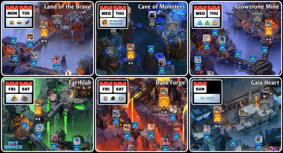 Midweek, on Wednesdays and Thursdays, the Cave of Monsters and Glowstone Mine are accessible. The Cave of Monsters provides chances to acquire powerful pets and develop their skills, while the Glowstone Mine offers opportunities to obtain chief charms essential for progression.