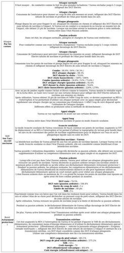 De plus, Varesa bénéficie d’un bonus d’attaque de 35 % pendant 12 secondes dès qu’une éruption noctâme est déclenchée, avec une possibilité de cumuler jusqu’à deux fois ce bonus. Ce mécanisme encourage la présence de personnages de Natlan dans la composition de l’équipe, afin de maximiser cet effet.