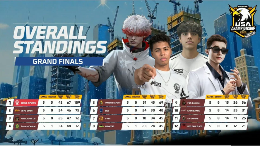 The final standings of the Winter USA Championship 2025 showcased a competitive field, with Zeus Esports leading at the top with an impressive 109 points. Closely following were 787 Esports and Anexados USA, earning 75 and 72 points respectively, both securing strong positions in the leaderboard. Rosario Central and Tambriz Esports finished with 72 and 69 points, placing them within the top five, while Blue Esports claimed sixth place with 48 points.