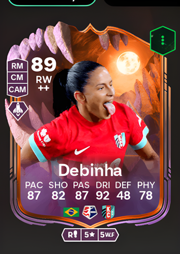 Débora C. de Oliveira's Ultimate Scream card is an exceptional Right Wing boasting an impressive overall rating of 89, highlighted by standout attributes such as a blistering 87 pace, a sharp 82 shooting, a precise 87 passing, and an elite 92 dribbling, complemented by 78 physicality. As a winger, her card is quoted as a sharp attacking player, designed to utilize her explosive speed and masterful ball control to quickly tear apart the opposing team's defense, creating opportunities to score decisive goals and seal the deal in crucial moments of the game.