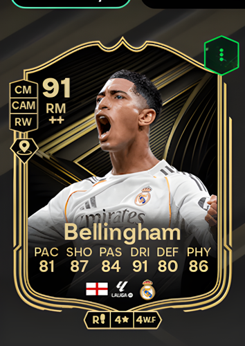 Jude Bellingham’s latest Team of the Week card showcases him as a dynamic Right Midfielder with an impressive overall rating of 91. Boasting standout attributes such as 81 pace, 87 shooting, 84 passing, and an exceptional 91 dribbling, he is well-equipped to dominate on the flanks. With additional strengths in defense (80) and physicality (86), Bellingham’s card offers a remarkable blend of attacking flair and defensive reliability. As a right midfielder, his sharp attacking prowess and ability to break through defenses make him an invaluable asset for quickly creating scoring opportunities and turning the tide of any match in your favor.