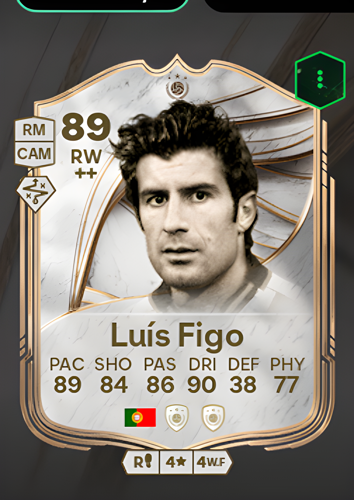 Luís Filipe Madeira Caeiro Figo's Icon card, positioned as a Right Wing with an impressive overall rating of 89, stands out with exceptional attributes: 89 pace, 84 shooting, 86 passing, and a remarkable 90 dribbling. As a winger, Figo’s sharp attacking prowess enables players to swiftly break through the opposition’s defense, creating scoring opportunities and turning the tide of any match. His combination of speed, technical skills, and vision makes him a game-changing asset, ideal for sealing crucial victories and dominating the flanks.